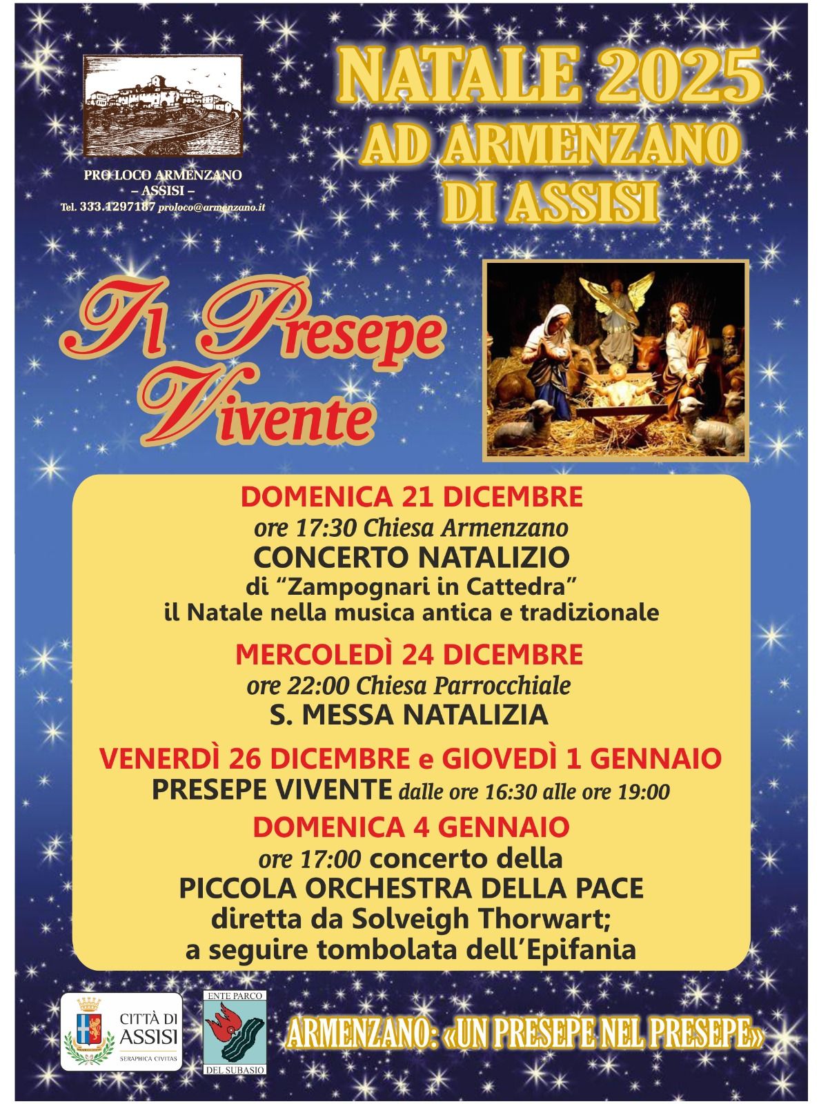 Quest'anno il programma natalizio della Proloco di Armenzano nno č solo il Presepe Vivente, previsto per il 26 dicembre e 1 gennaio dalle 16.30 alle 19.00.